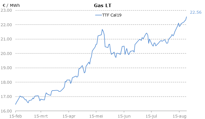 De curve raakte verder in backwardation. De voorkant van de curve ging gisteren bij opening onmiddellijk omhoog en sloot op de wintermaanden Dec18, Jan19 en Feb19 bijna 0.40 Eur/MWh hoger dan eergisteren. Behoorlijk bullish dus. De achterkant van de curve bleef achter en sloot maar 0.05 Eur/MWh hoger. De oorzaak was de sterke stijging van de olieprijs eergisteren. Die was duidelijk nog niet verwerkt in de gasprijs. Bovendien neemt de premie voor de genoemde wintermaanden toe nu de injecties in storages nog steeds achterlopen op schema. De spread Win18xSum19 werd gisteren op 4.225 Eur/MWh als high gehandeld. De closing was 4.175 Eur/MWh. Wellicht raken we langzaam op het hoogste punt, maar er is nog steeds een reële kans dat deze spread nog verder oploopt. Echt bearish signalen zien wel nog niet voor de komende winter.