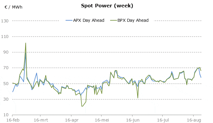 De spotprijzen kwamen uit voor 58 €/MWh voor de basecontracten en opmerkelijk genoeg 57.20 voor de piek contracten. Dit wordt voornamelijk gedreven voor hoge wind productie gedurende de dag in combinatie met zonnig weer. Wel interessant is dat er voor vandaag een beperking is van de transport capaciteit vanuit Noorwegen richting Nederland, van de 700 MW is er slechts 100 MW beschikbaar. Tennet heeft al opgeroepen dat het krap kan worden qua beschikbaarheid.