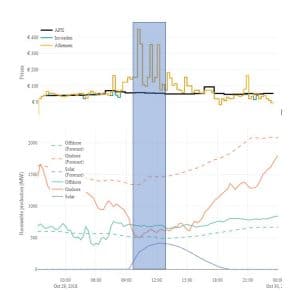 Zoals uit de bovenstaande figuur opgemaakt kan worden was de day-ahead verwachting dat onshore wind geleidelijk zou toenemen gedurende de dag. Eigenlijk zien we dat aan het begin van de dag de windvoorspelling al achterbleef en omstreeks 9 uur sloeg de vlam helemaal in de pan en was er plotseling omstreeks 800 MW minder dan verwacht. Ofwel een forse kolencentrale. Dit soort plotselinge tekorten gedragen zich in de prijsgrafieken ook nagenoeg hetzelfde als wanneer er een centrale onverwachts uitvalt.