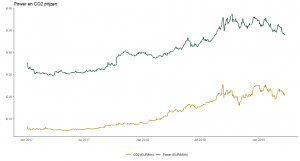 Uit de onderstaande grafiek blijkt dat de CO2 prijs invloed heeft op de powerprijzen. Een onverwachte grote impact van Brexit kan daarmee ook doorwerken in de powerprijzen. Voor de lange termijn hebben veel landen, waaronder Nederland, een minimumprijs voor CO2 ingesteld. Aangezien de CO2 prijzen de afgelopen tijd hard zijn gestegen, lijkt deze minimumprijs achterhaald.